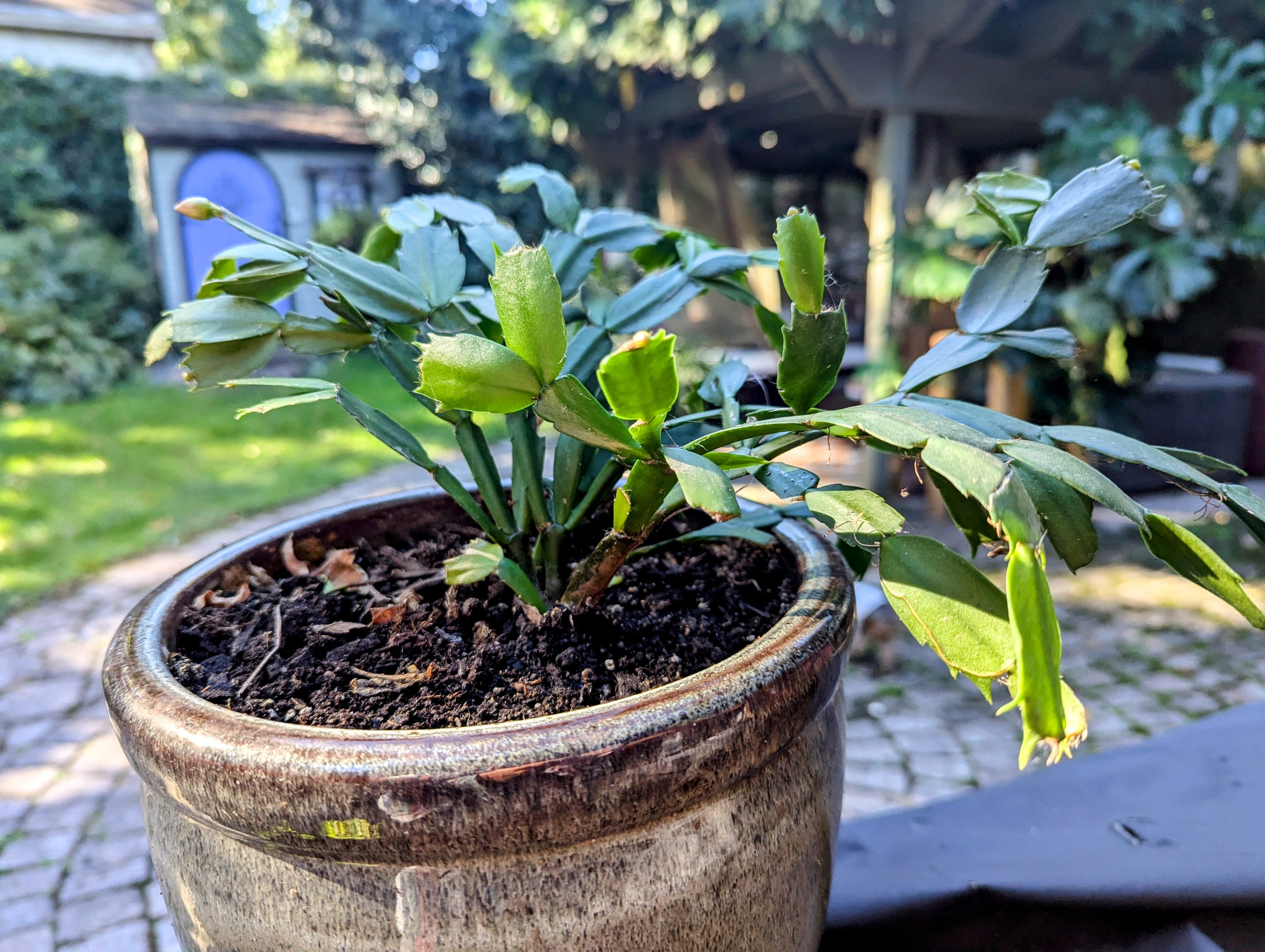 I placed her with her babies on a plant bench on our deck where I thought she would be safe. One day I went to check on her and found the majority of her beautiful stems broken. Many were laying on the ground. Others were still in the pot disconnected from her root system. I suspect a squirrel, or some other animal, had used her as a springboard to hop into a tree or make a bed in.